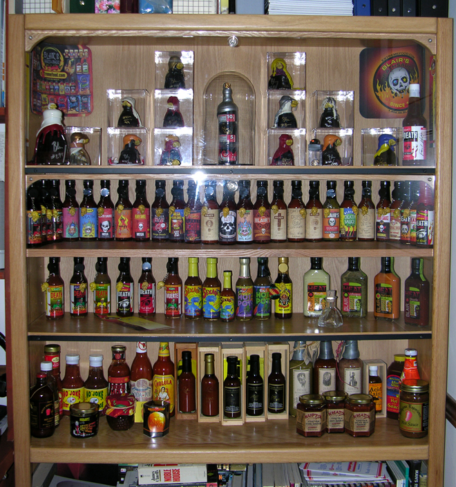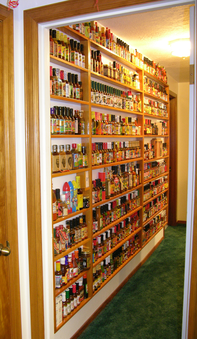 This picture shows the main Hot Sauce collection in one of the hallways in my house. The shelves are
